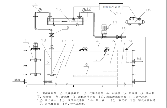 溶气水通过溶气释放器17进入气浮池接触区2,池水中出现大量微气泡使清水变乳白色,即可认定溶气系统正常。溶气水的压力可看出水管道上的压力表读数正常值为0.4-0.45MPa,该压力的大小可用溶气水控制阀14开启的大小来控制,在水泵11可供压力范围内调整,一般水泵出口管道上的压力表12取5~5.5Kg/cm2。